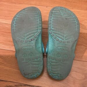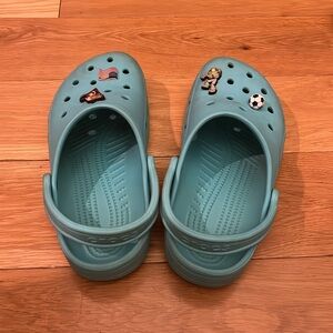 Condition: used (can be cleaned, they are rubber) Size: Women’s-9 Men’s-7 Color: Aqua blue JIBITZ CAN BE REMOVED, but I will include them