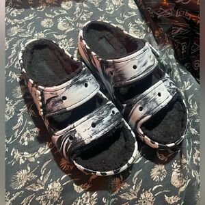 Back and white marble fuzzy crocs used them a couple times but the bottom part is in good condition used them indoors only . Size 5 in men & 7 in women