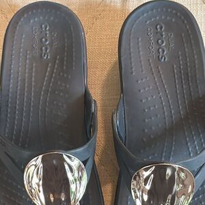 Crocs Sanrah Liquid Metallic Wedge Flip Sandal Womens Sz 10 Silver/Navy Blue NEW no tags