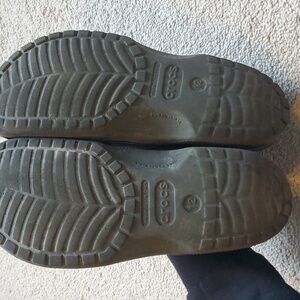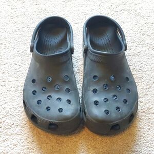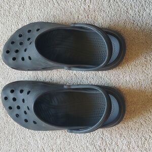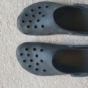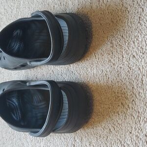 Comfortable Crocs with strap. Perfect for casual wear. These are so great for the spring and summer months. Have been worn, but lots of life left. They are between a black and charcoal grey.