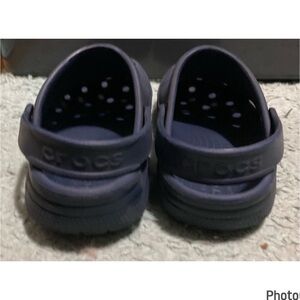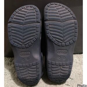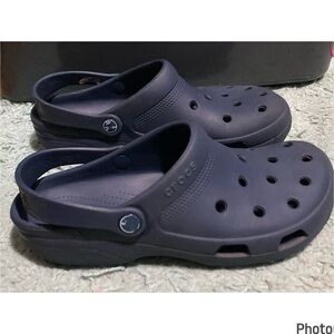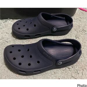 Hardly worn, in great used condition, unisex iconic crocs comfort in navy blue. Women’s size 11, men’s 9.