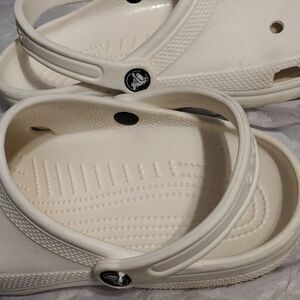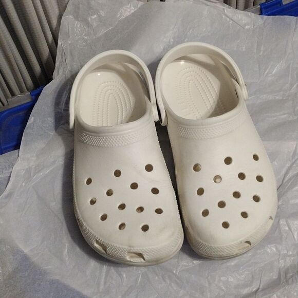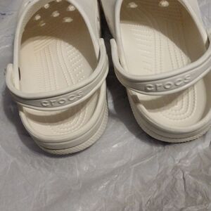 white sling back Crocs, women's 11, Men's 9, minimal wear on soles. light marks on toes