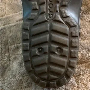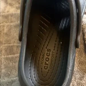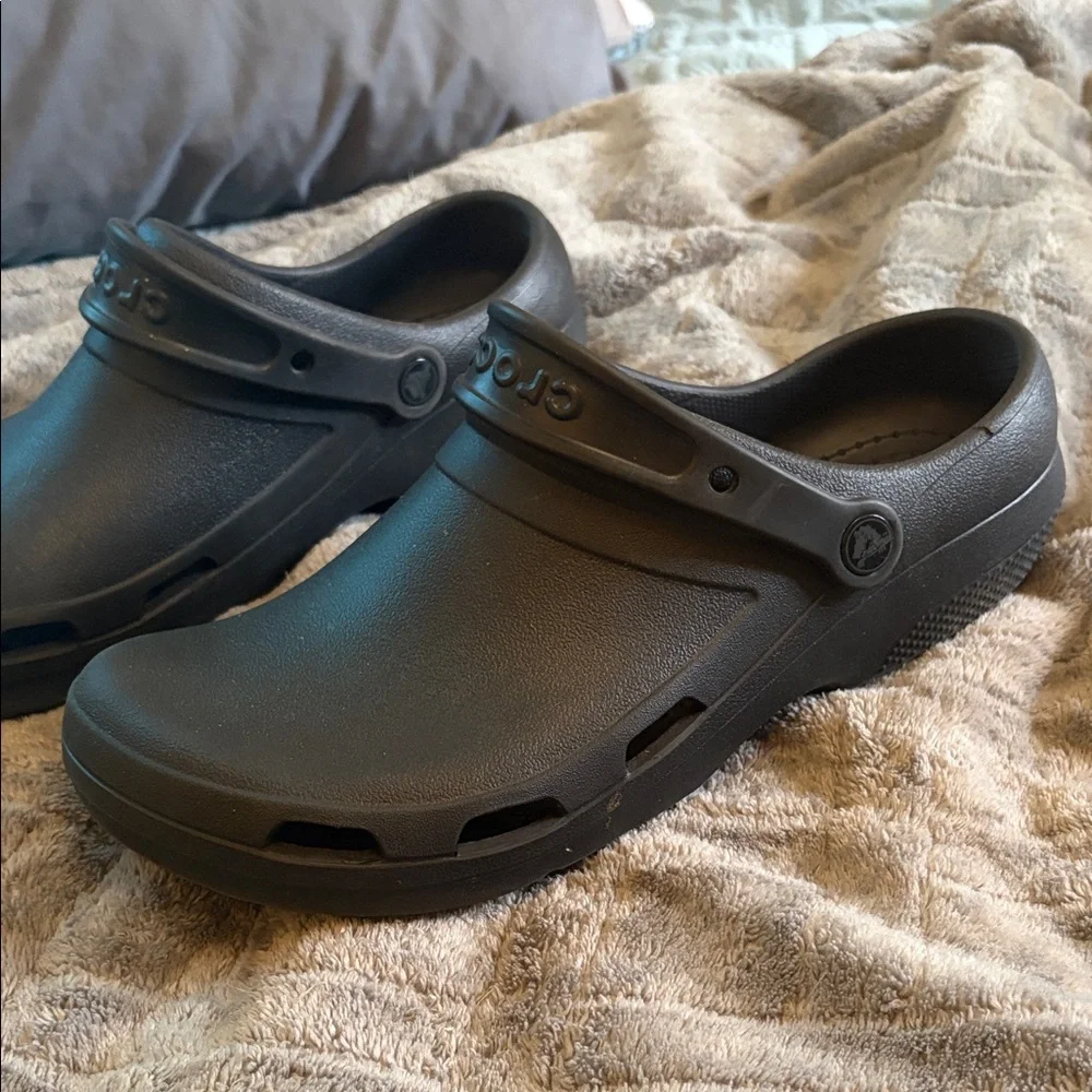 Men's CROCS slip-on clogs in black. Lightweight EVA construction for easy wear. Ventilation ports add breathability. Cushioned footbed for all-day comfort. Heel strap offers secure fit. Excellent condition.