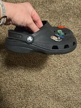 Boys black crocs size 1 with accessories. In good condition with minimal signs of wear.