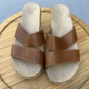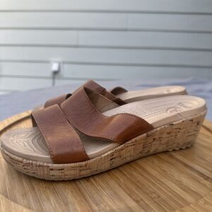 Crocs A-Leigh Cork Mini Wedge Sandals Shoes Womens Size 6 Brown Leather Comfort