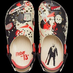 You were warned. The Classic All-Terrain Clog that’s ready for it all now gets a frightening twist. Paying homage to the Friday the 13th horror film series, this rugged clog features a blood-splatter graphic and Friday the 13th themed Jibbitz™ charms. With a rugged lug outsole and an adjustable turbo strap, the ground beneath your feet has never felt more surmountable. The lightweight construction and Crocs comfort make them a fun and practical choice for Halloween parties and other outings. Flip that strap back and enjoy the scary season!
