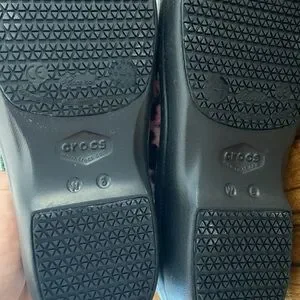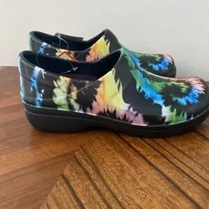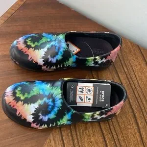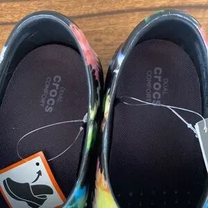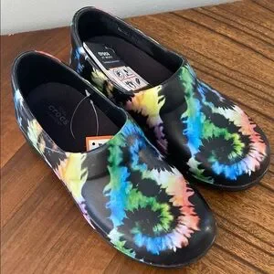 Women’s size 6 Crocs nursing type clog, never worn. Black with colorful tie dye print ❤️