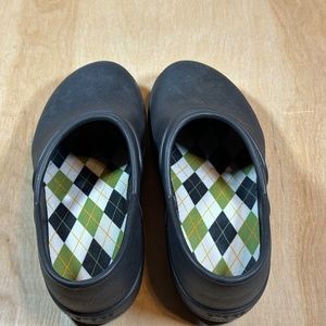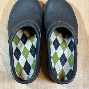 Good condition size 7 women’s crocs slip on clogs. Black exterior with green, white and black plaid interior. Some slight wear.
