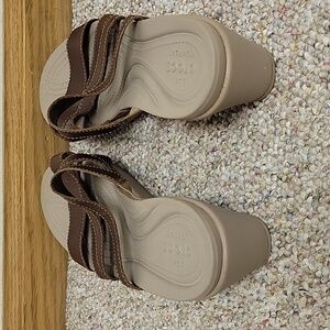 Crocs women's Leigh Ann wedge sandal. brown leather, 2.5" wedge heel. sz 10