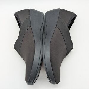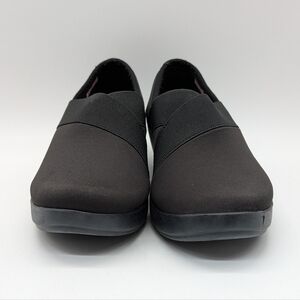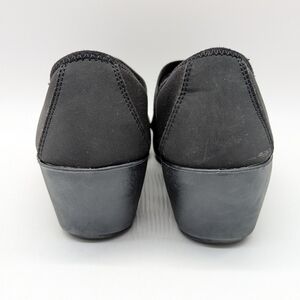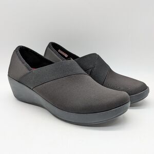Crocs Busy Day Stretch Black Asymmetrical Slip On Wedge Shoe 8. Light pilling at the inside heel (see photo)