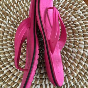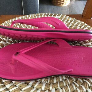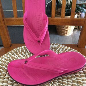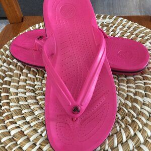Crocs CROCBAND Flip Flops Size 8 Women's Thong Sandals. Dark Pink Crocs flip flops that are a thong style and slip-on closure. They are made of synthetic material and are perfect for the beach or pool use. These Crocs are part of the comfort shoes category and are in excellent condition.