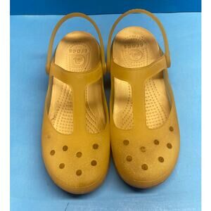 Step into sparkle with these adorable Crocs Carlie clogs! Featuring a golden glitter finish and charming cutout dot design, these T-strap sandals are perfect for adding a touch of fun to any outfit. In women's size 8, they offer the classic Crocs comfort you love with a stylish twist.