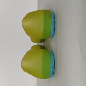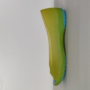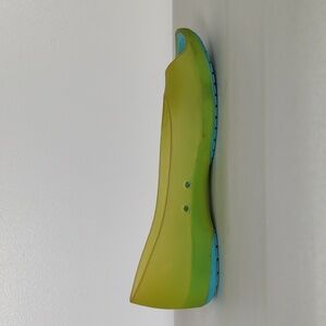 Green upper with blue sole. Iconic Crocs comfort sole. Some divets in the sole and insole and some small dirt spots (see photos). Otherwise in great condition.