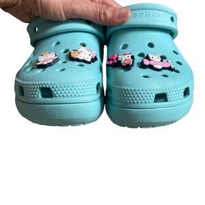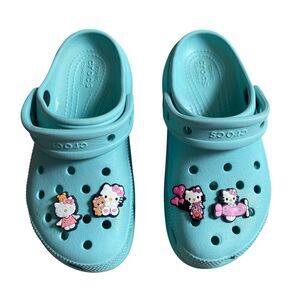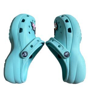 Crocs Classic Platform Clogs Girls Size 4 EU 36 Aqua Blue With Hello Kitty Charms. They are in excellent pre-owned condition.