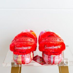 This Crocs Adult Classic Fur Sure Clog is as cozy as they come with a bright red fur upper. The plush fur fills the inside of the clog for extra cushy comfort. The midsole of the clog has a printed Sweetheart design, with a variety of colors and hearts. Each pair comes complete with six oversized Jibbitz charms that are made to look like the classic Sweethearts candy. The Jibbitz have a plush finish to match the clog’s furry aesthetic.