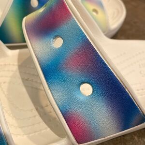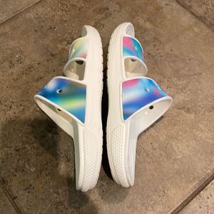 Classic Two Band, slip-on, slide sandal shoes by Crocs in unisex size men's 6 and women's 8. White with pink and blue space dye tie dye bands. Soles are are in great shape with minor signs of use. Clean insoles. Color on bands is still very vivid and crisp. Style number 207771. In great pre-owned condition.