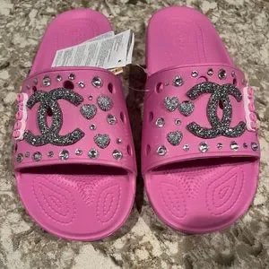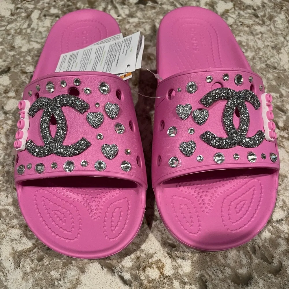 The croc is bubble gum pink with different shades of sliver (light/dark) bling which is non removable.