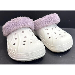 Crocs Dual Comfort Clog White with Purple Faux Fur Liner, Classic Slip On Lined W6 Machine Washable Fuzzy in USA Women’s 8 or Men’s 6. In good preowned condition, but the inside furry part is worn in and lays down & is dirty.