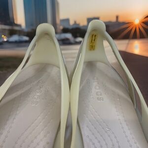 Step out in style with these Crocs Isabella flats, perfect for any casual or travel occasion. The slip-on design and open toe make them easy to wear, while the lightweight and breathable synthetic upper material ensures comfort all day long. These flats come in a metallic yellow color with a metal theme, and are available in US shoe size 7 for women. The Crocs brand is known for its quality and durability, making these shoes a great addition to any wardrobe. Whether you're heading out for a summer day or a fall evening, these Crocs Isabella flats are the perfect choice.
