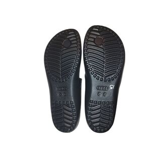 Vibrant floral flip flops by Crocs. Features a colorful design with pink, yellow, and purple accents on a black base.