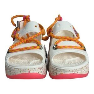 The Crocs Hiker Xscape Festival Platform Sandals in Women's Size 6 feature a slip-on closure with adjustable string and strap accents. These colorful multicolor sandals have a mid-height heel and a rubber outsole, making them perfect for travel, activewear, and casual occasions. The sandals are adorned with adjustable string and strap features, a confetti pattern, and the iconic Crocs character, making them a fun and vibrant choice for the summer, fall, and spring seasons. Made with a rubber upper and insole, these sandals offer both style and comfort for women looking to make a statement.