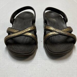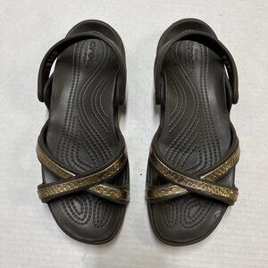 Crocs Huarache Sandals Womens 9 Brown Gold Strappy Wedge Croslite Jelly Casual