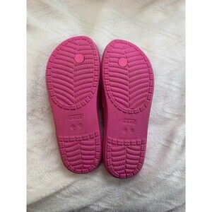 The product is a pair of women's size 8 pink thong flip flop sandals by Crocs. These slip-on sandals feature a flat heel and are made of synthetic material for comfort and breathability. Perfect for casual wear, these iconic Crocs flip flops are easy to wear and add a pop of color to any outfit. Ideal for warm weather and poolside lounging, these sandals are a stylish and comfortable option for women on the go.