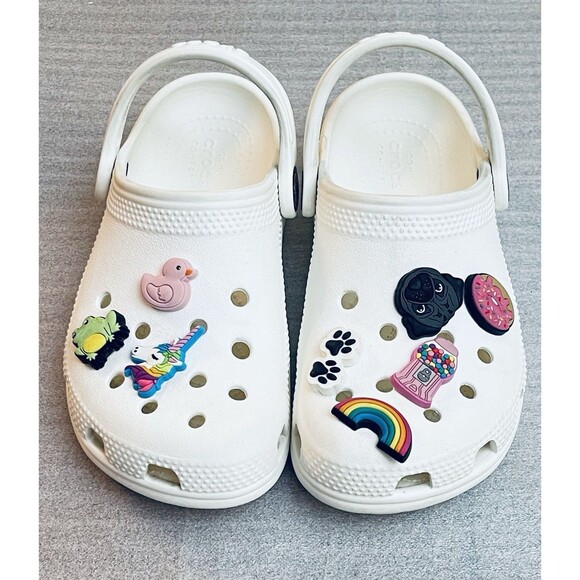 Crocs Iconic Comfort Kids Sz C12 White Slip-On Sandals w/ 8 Charms Unisex