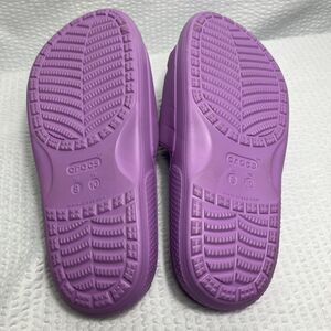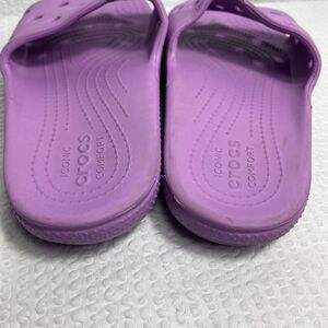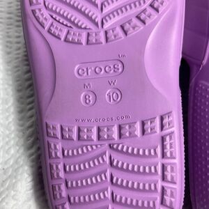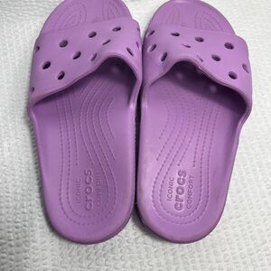 Gently used. Crocs slide sandals in purple. 8 men, 10 women.