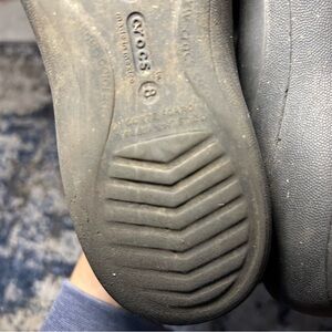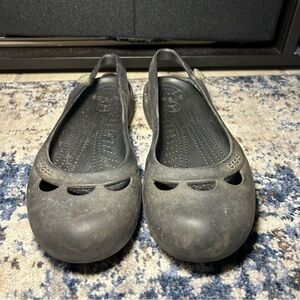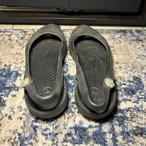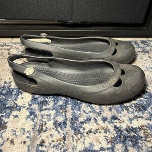 Crocs Jayna Black Slingback Slip On Flats. Has some signs of wear on the sides and tops. As shown in photos above. Minimal signs of wear on the bottoms. Also shown in photos above. In otherwise great preowned. Feel free to make a reasonable offer through the offer button!
