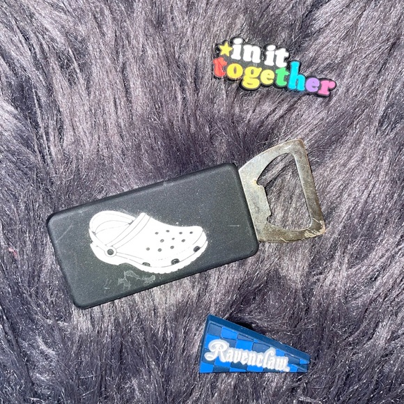 Vibrant Jibbitz charms for Crocs. Includes 'in it together' and 'Ravenclaw' designs as well as bottle opener. Perfect for personalization.