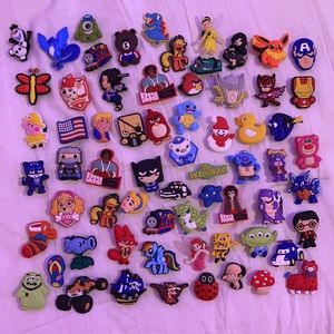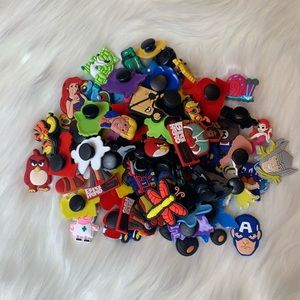 -some of the jibbitz include: olaf, big hero 6 characters, angry birds, spongebob, minions, thomas the train, princesses, disney characters, and many others as you can see in the second and third photos (updated 9/16/20)