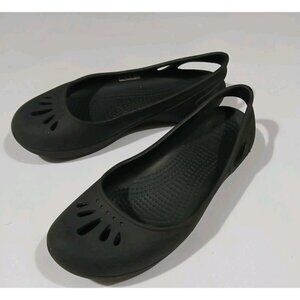 Crocs Kadee Slingback Ballet Flats. Size 6. Black. Laser cut detailson toes. Rubber. Lightweight. In nice, preowned condition. Light wear to bottoms.