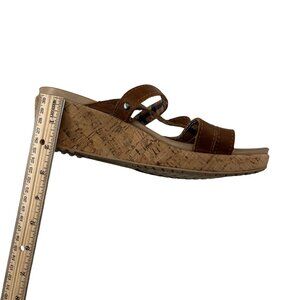 Slight scuffing on leather straps and cork sole. Ruler shows approximately 3-inch wedge height.