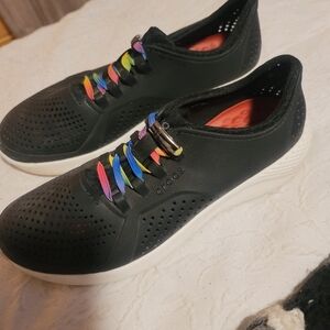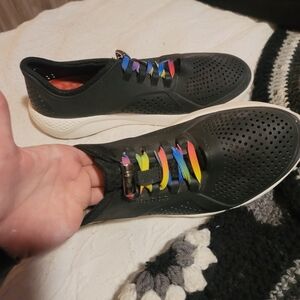 Get ready to step out in style with these Crocs Literide 360 slip-on shoes. Featuring a basic black design with rainbow laces and made from durable rubber, these shoes are perfect for any casual occasion. The slip-on style makes them easy to wear and take off, while the US shoe size 8 ensures a comfortable fit for women.