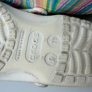 Pre-owned. Normal wear on soles. Decorative pieces appear securely attached. Comes with original Crocs box (box has some damage).