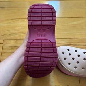 Crocs Mega Crush Clog Womens Size 9 Pink Purple Platform Ankle Sling Flexible. Tread on shoes is in excellent condition. Shoes have a few scuff marks as shown in photos. Mens size 7. Smoke free home.