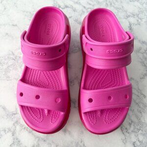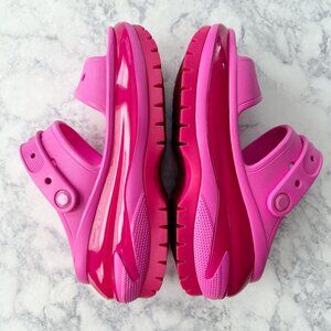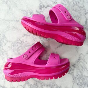 Crocs Mega Crush Sandal in Juice Pink. Platform slip-on sandals with thick soles for comfort and support. Strap can be worn on top of foot or act as ankle strap. Y2K vibes. *AI cover photo depicting style of shoe. TikTok viral shoes. Throw on your favorite Jibbitz for extra flair!