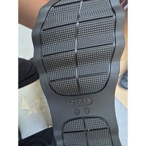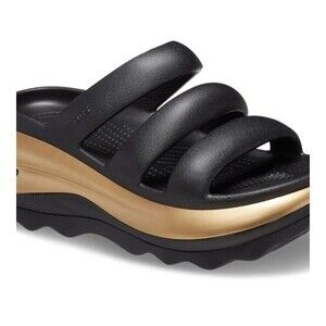 The Crocs Mega Crush Triple Strap Mens 7 / Womens 9 Metallic Black/Gold Sandals are stylish slip-on sandals ideal for casual or travel occasions during the summer and spring seasons. These sandals feature a mid-height heel, rubber outsole, and synthetic lining and upper material. The metallic black and gold accents add a touch of glamour to the solid black color, making them a trendy choice for women that enjoy a comfortable, flat heel style. Made by the popular brand Crocs, these sandals are a fashionable and practical addition to any summer wardrobe. NO BOX
