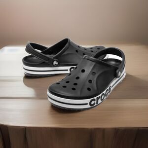 Experience the perfect blend of comfort and style with Crocs' Black Bayaband Clogs, designed for both men and women. These size M7/W9 sandals boast a sleek black hue complemented by the iconic Crocs logo, creating a look that's both timeless and contemporary. The durable rubber upper and straps provide a secure fit while ensuring breathability and water resistance, making them ideal for any season.
