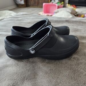 Crocs Mercy Work Clogs. Women's size 7. Preowned in good condition. Made for on-the-job comfort. Roomy by design like the original Classic Clog, the Mercy Work Clog offers generous room all around the foot. It has Crocs Lock tread for slip-resistance, a heel-hugging backstrap, and a closed heel.