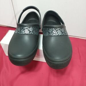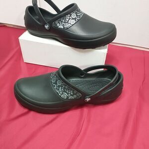 Crocs Mercy Work Women's SZ 11 Clogs Black Silver Floral Comfort.