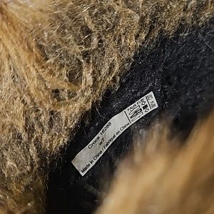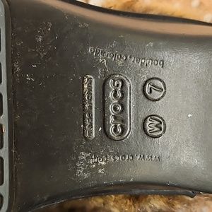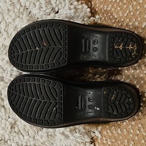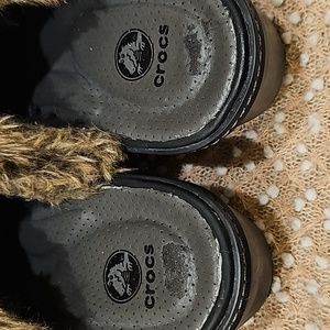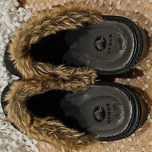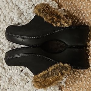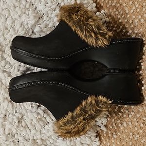 Crocs Cobbler Eva black leather clogs womens slip on Mules size 7W, tan/brown faux fur trim, soft faux fur inside, stitch detail, 2.5" heel, rubber soles, gently worn in excellent condition see all photos for details!