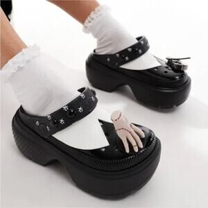 Crocs Wednesday Addams Stomp Clog with Thing hand & violin cello Jibbitz chunky Goth platform shoes. Limited edition release, perfect for Halloween!