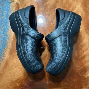 Crocs Neria Pro II Clogs. Pretty and sleek Black with Silver Floral design. Slip Resistant tread. Womens size 6.