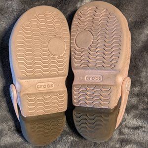 Pink, slip-on classic clog sandals shoes by Crocs in Unisex children's size C10. Soles in good shape with some slight wear to the heels. Uppers also in good shape with minor signs of use. Insoles very clean. Logos on hinges have some wear which is common. See photos. In good pre-owned condition with some signs of wear from normal use.
