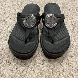 Crocs Sanrah Beveled Circle Sandals Sz 7 Black Silver Comfort Casual