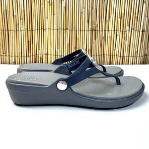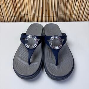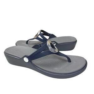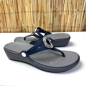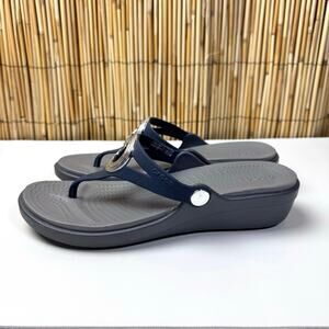 Crocs Sanrah Wedge Sandals Womens Size 8 Navy Silver Beveled Circle Slip Ons