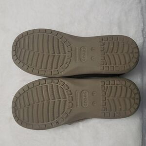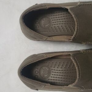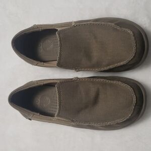 Grate Crocs Santa Cruz slip-on Sz J5 youth, made of canvas gray and dark tan, light weight and comfy, in excellent condition.