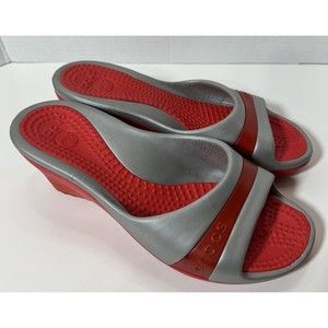 Crocs Sassari Women's Red/Gray Open Toe Slip-on Wedge Heel Slide Sandals Size 9. In very good used condition. Item. has a very small like ink stain on the each side of the shoes but barely noticeable. Please see pictures for item description and measurements.